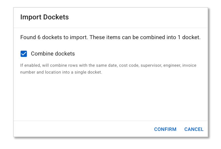 Docket Unifier: Enter a unifying number or text to manually combine rows in the template into one docket. Rows with the same Date, Invoice Number, Cost Code, Foreman, Engineer, Location, Order Number and Ticket Number (the optional fields can be left blank) can be combined into one docket.