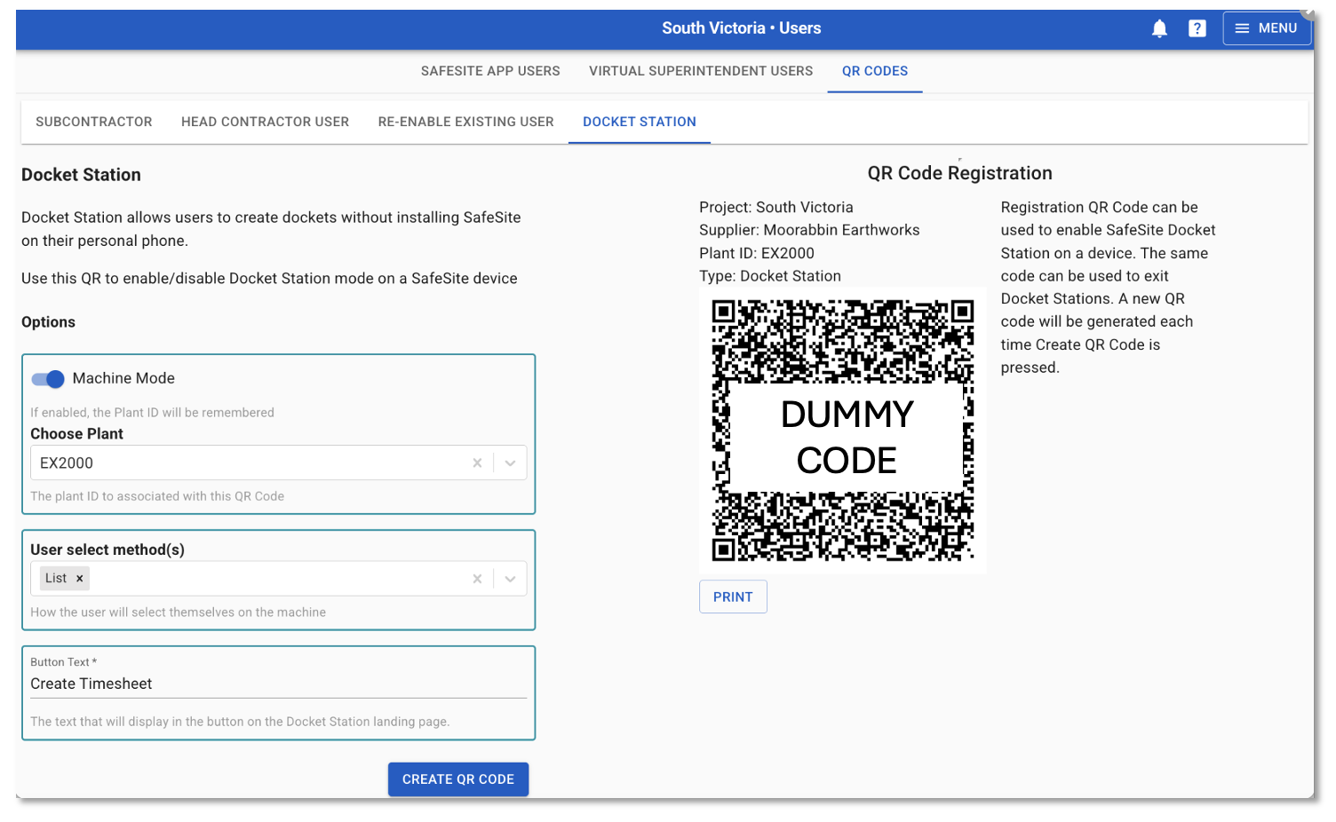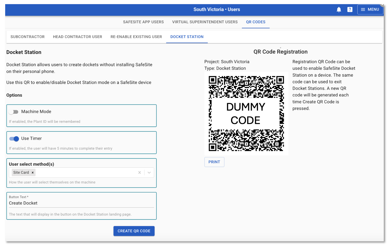 Head contractor Virtual Super users with the User Admin or Admin Manager permission can access the Users page, where the SafeSite Docket Station is configured for Machine Mode or Kiosk Mode and the QR code is generated.