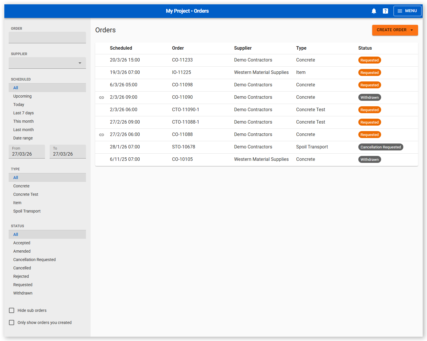 The Orders pages in Virtual Superintendent is used to create, manage, and track supplier orders. This section describes how to open to Orders page, filter the page to show specific existing orders, and create a new order.