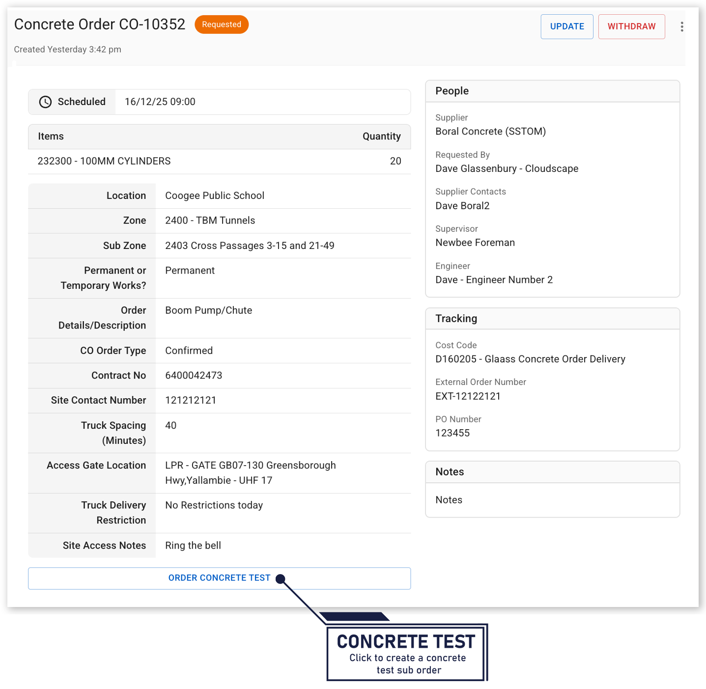 When viewing a concrete order form, the creator can click Order Concrete Test at the bottom of the order summary to generate a concrete test sub-order.