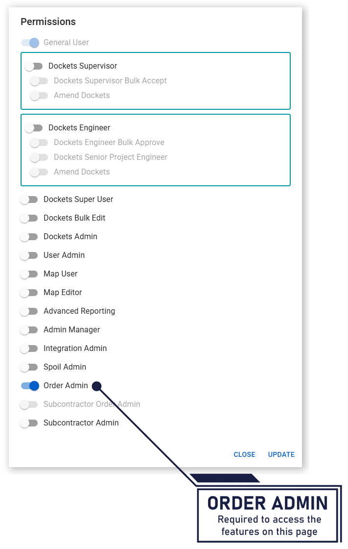 To access the Orders page, enable the Order Admin permission.