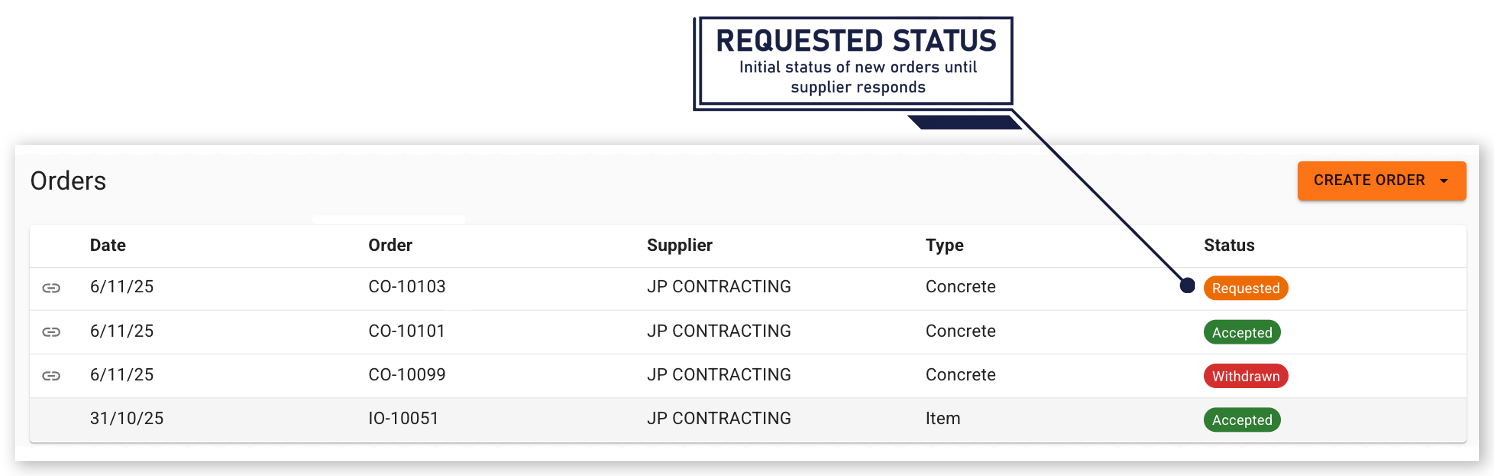 After creation, orders are displayed with a status of Requested until the supplier responds.