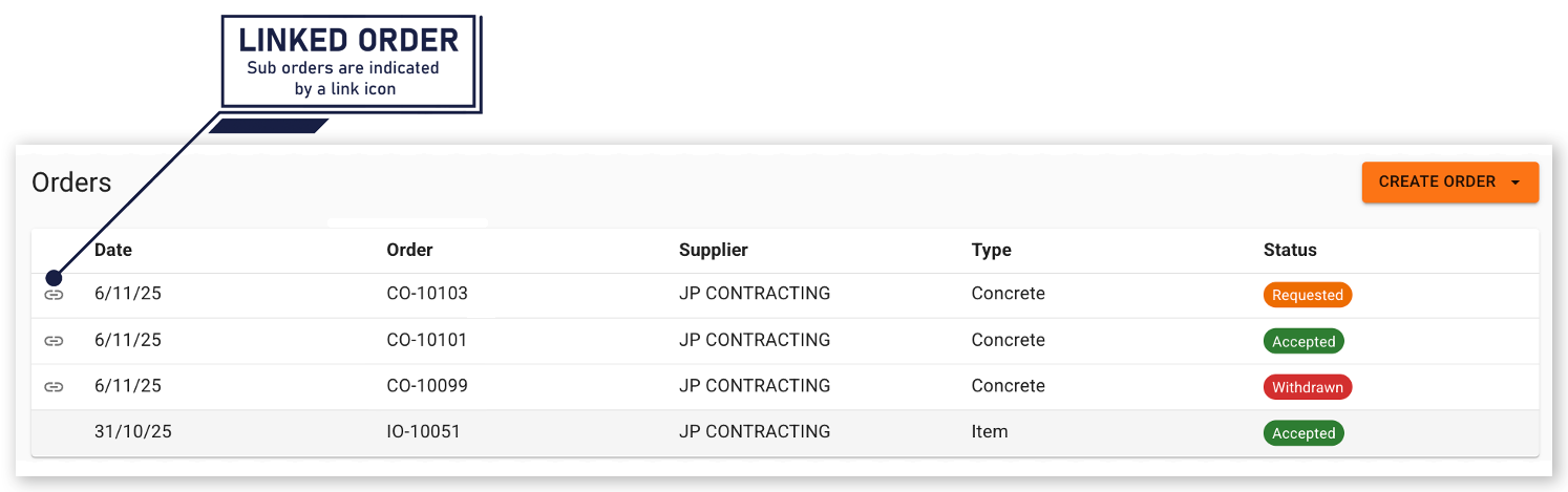 - Display with a link icon in the Orders list: