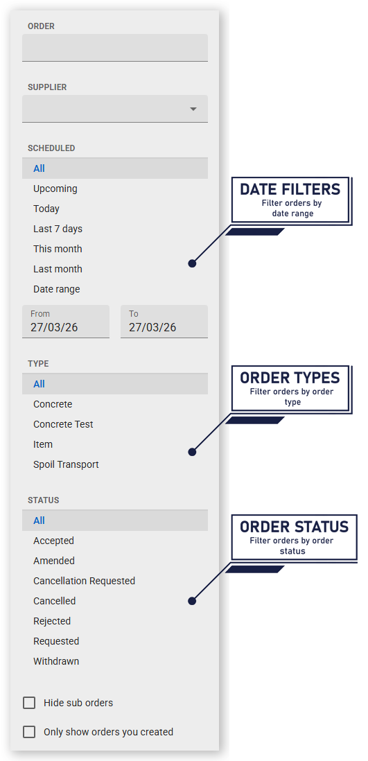 - Hide sub orders to show only parent orders (to, for example, hide all concrete test sub-orders)